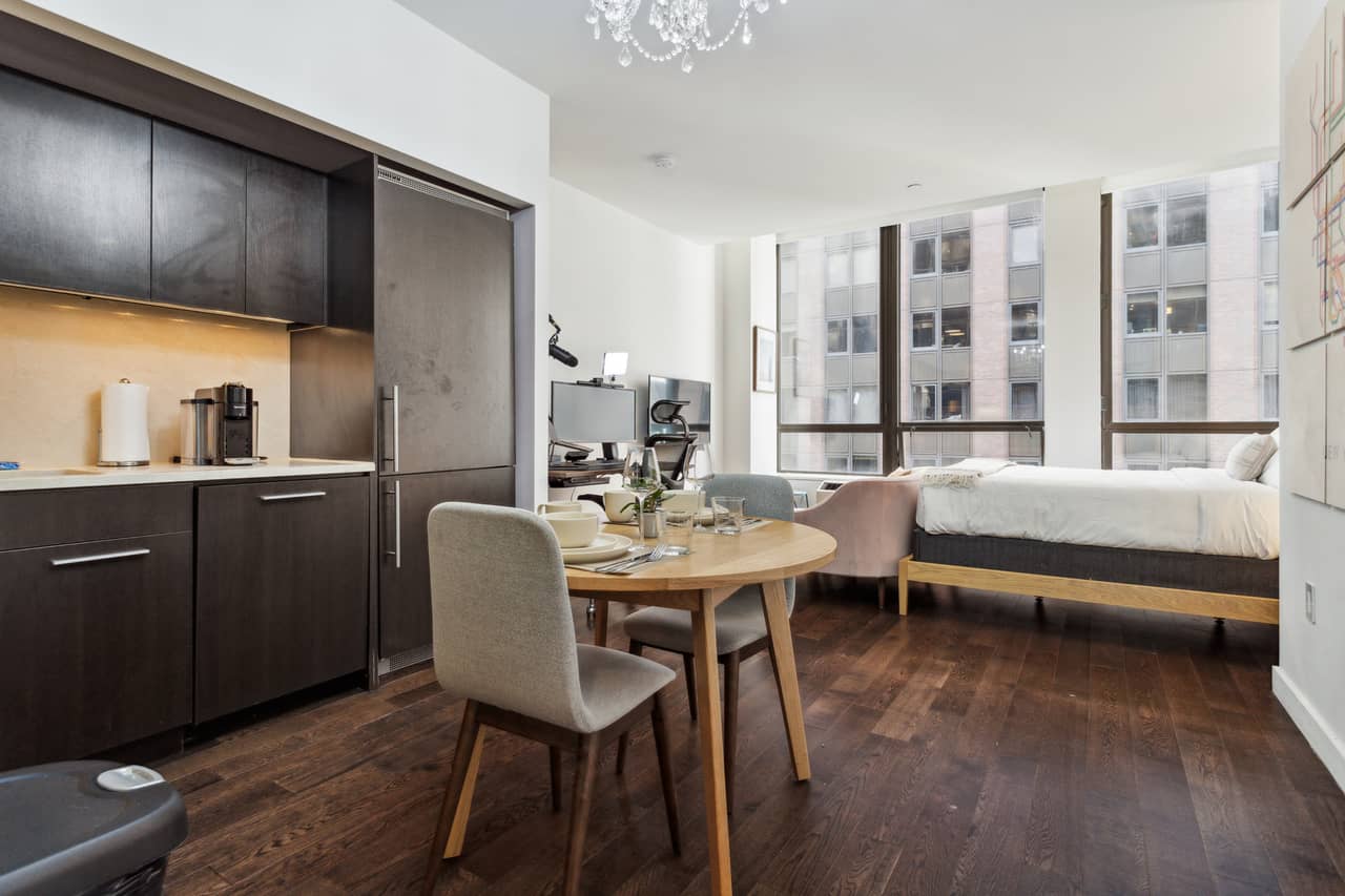 Studio Apartment95 Wall St, New York, NY 10005, USA | ID: 8827From the spectacular rooftop terrace views to the state-of-the-art fitness center, 95 Wall is your home in the heart of the financial district, convenient to everything that matters. Stroll to work, jog to The Battery, or jump on the FDR- this is the luxurious and comfortable space you've been looking for. Custom designed for the remote worker looking for a comfortable and inspiring environment in which to be productive, this unit includes a fully equipped kitchen, queen size Lisa Hybrid mattress, Nespresso coffee machine, full bathroom, smart TV, and all utilities. Most importantly, it features a full home office setup with private high-speed internet that you won't find anywhere else. *The building is currently undergoing renovation and is expected to continue until Spring 2026* Home office setup includes: - Private high-speed internet - Standing desk (Autonomous) - Work chair (Autonomous) - 34-inch ultra-wide monitor (Samsung) - Microphone (Blue Yeti) - Webcam (Logitech) - Computer speakers (Logitech) - Key light - Monitor light - Green screen - Keyboard (Logitech) - Mouse (Logitech) - Laptop stand - TOTU 16-in-1 Triple Display USB-C 3.1 Docking Station Amenities include: - Washer and dryer in unit - Stocked kitchen - Dishwasher - Business Center - Fitness center - Rooftop terrace & lounge with gas fireplace & BBQs - Elevator - Bike storage - Dry cleaning services - Concierge services - 24hr doorman - Walgreens Pharmacy (Duane Reade) on the ground floor - Starbucks Coffee on the same block: 99 Wall St - One block from the ferry port PLEASE NOTE: Internet speeds are not guaranteed, and may fluctuate based on your computer model and the router location The laptop computer is not included in the home office setup The A/C runs from May to October, and the heating system works from November to May. These settings are controlled by the building management, not by Anyplace Parking is not provided, but may be available via the attached public indoor garage. Guests must coordinate independently (other garage parking is also available nearby). Early/Late Check-in/Check-out Fees: → Early check-in from 9am-3pm will incur a fee of $75 → Early check-in before 9am will incur a fee of 1 full night's rent (based on selected dates) → Late check-in after 8pm will incur a fee of $50 → Late check-out from 11am-3pm will incur a fee of $75 → Late check-out after 3pm will incur a fee of 1 full night's rent (based on selected dates)